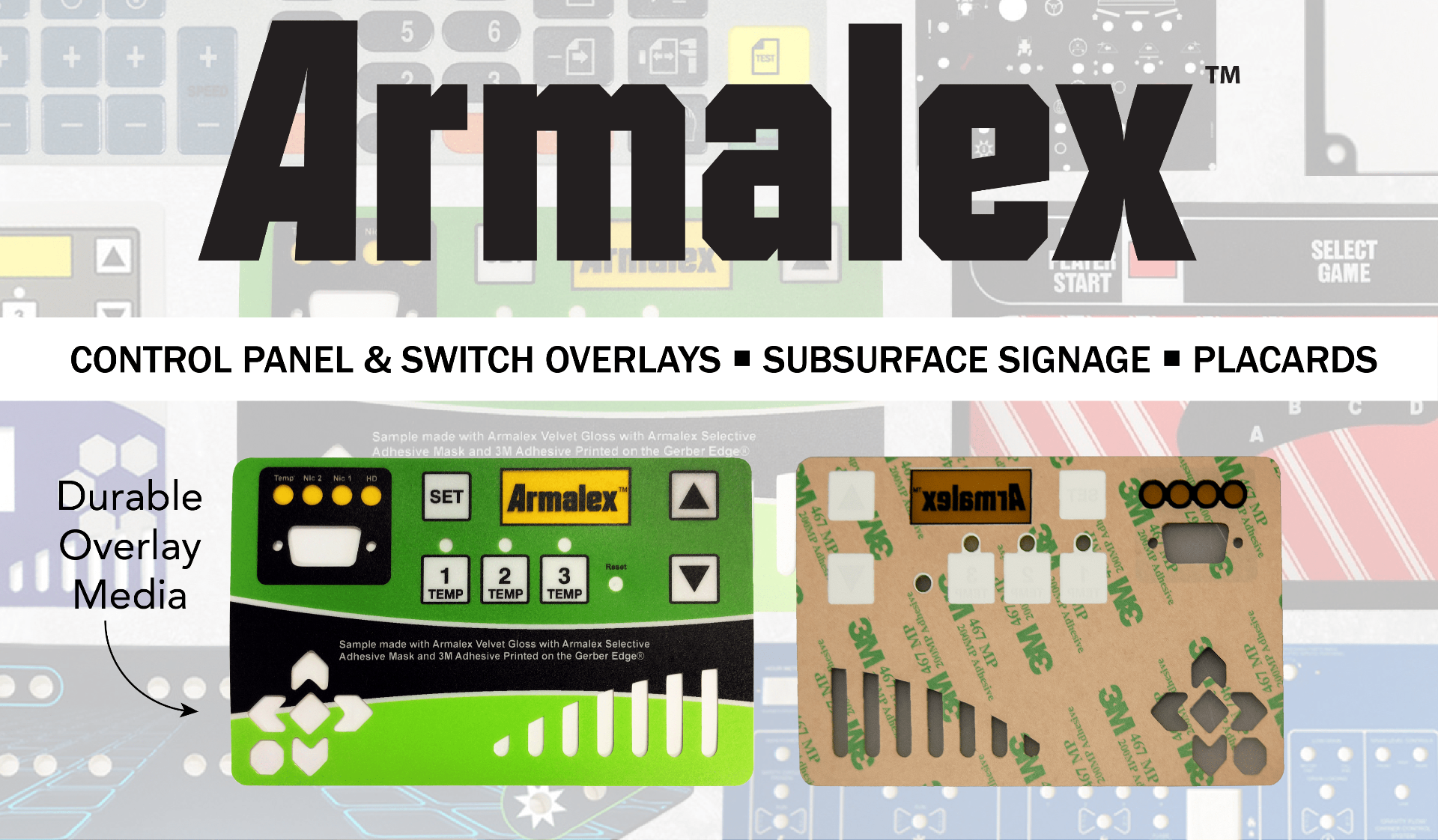 Armalex™ is a rigid, clear polycarbonate film that come in four finishes. Tough and durable, Armalex is perfect for control panel overlays and other markings that get a lot of rubbing or abrasion. Specially formulated for subsurface printing with the Gerber EDGE®. Armalex is rolled "print side" out and has a protective liner over the smooth surface that must be removed before printing.