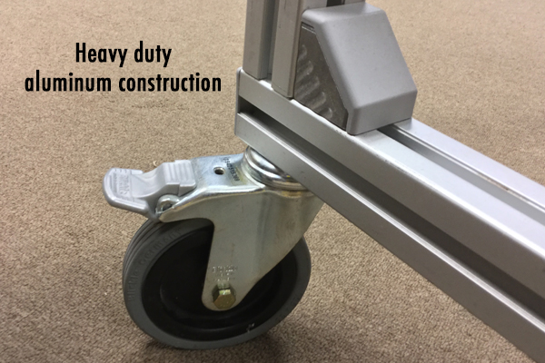The heavy duty aluminum construction features castered wheels and the rewinders are securely bolted into place. All cables are tucked out of the way.